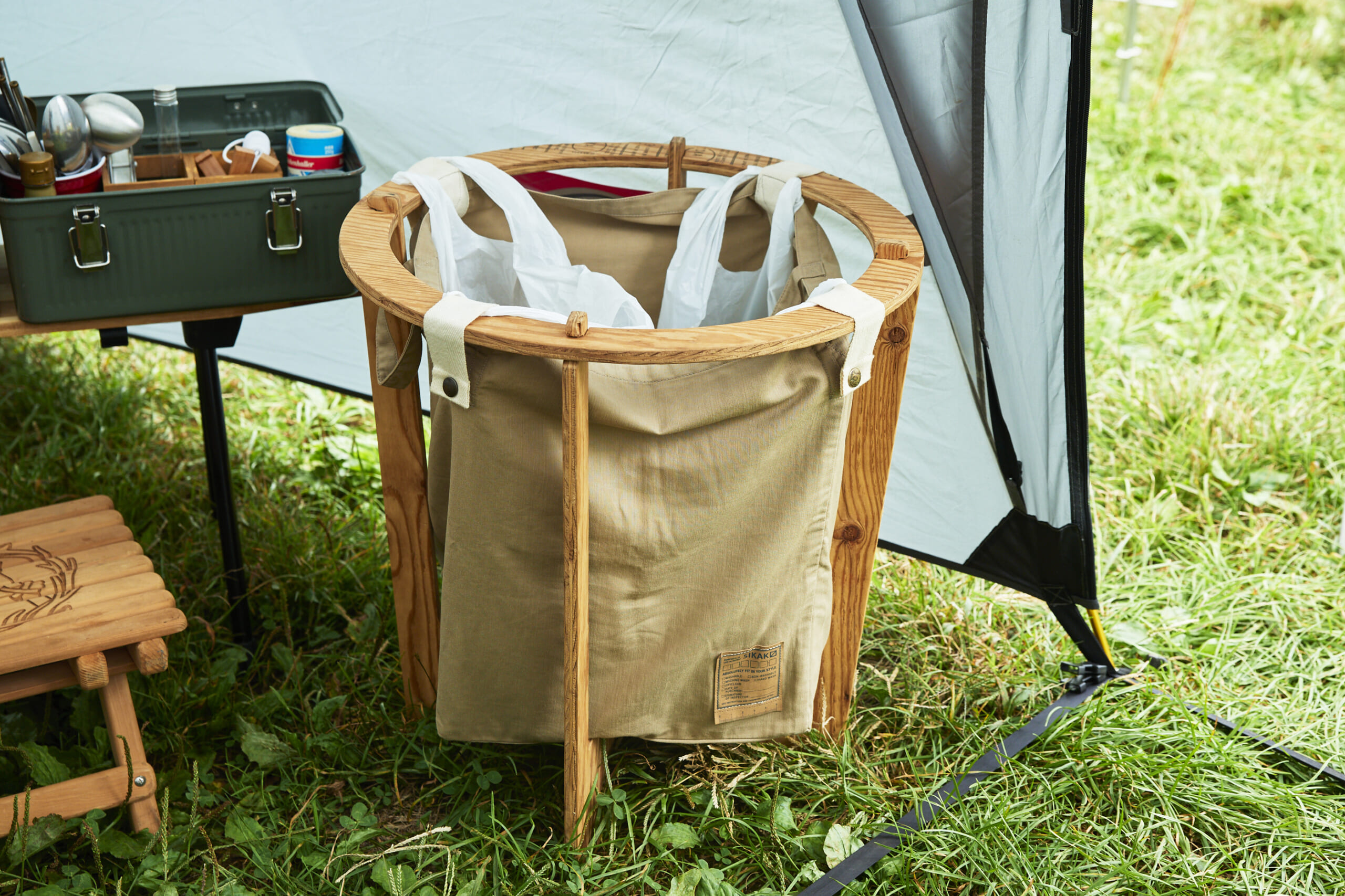 ゴミ箱もテイストを合わせたウッドベースのデザイン、ヨカ×シカクのアイテム。