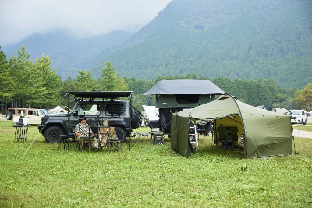 ダムドのリトルDパッケージのジムニーを、さらにカスタムしより一層ミリタリー感を強めたのリーさんは、クルマのテイストに合わせてテントサイトもミリタリー一色。もちろん、ランタンといった小物まで一貫して迷彩柄を選び、ランタンなどもミリタリーな雰囲気と相性のよいデザインでセレクト。とはいえ、存在感のあるテントはオリーブグリーンで選んだミニマルワークス。素材の軽さが全体をマイルドに仕上げてくれている。