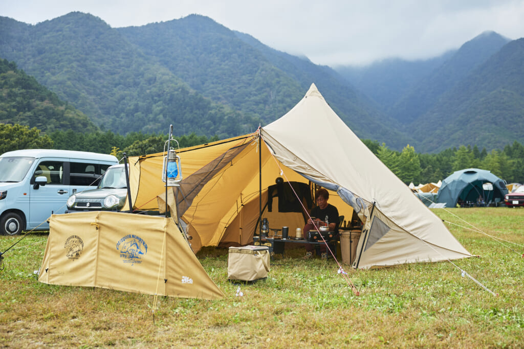 タンカラーのテントをベースに、焚き火周りのギアなども同色で揃え、すっきりとした印象。モーニンググローリーの中には寝室だけでなく、リビングやキッチンなどすべてを入れ込むことで、外からの見える生活感をうまく目隠ししたことで、よりまとまり感のあるレイアウトとなっている。室内の収納もコンテナをカスタムし、収納兼ディスプレイ。スペースはしっかり確保しながらも、全体的にコンパクトさも感じられるレイアウトとなっている。