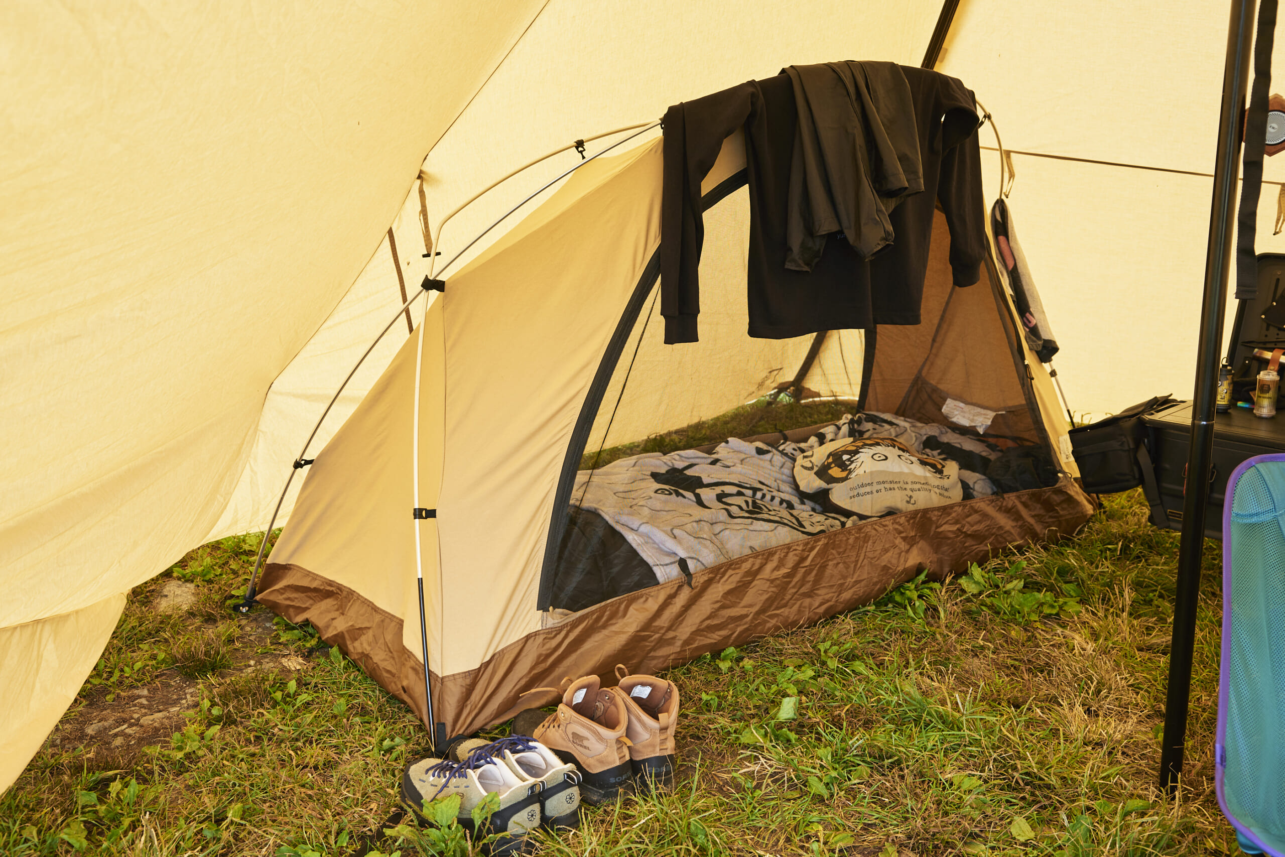 シェルターの壁に沿うような設計がされている、カンガルースタイル専用のテント。オールインワンでサイトを構成したい時にベストなアイテム。