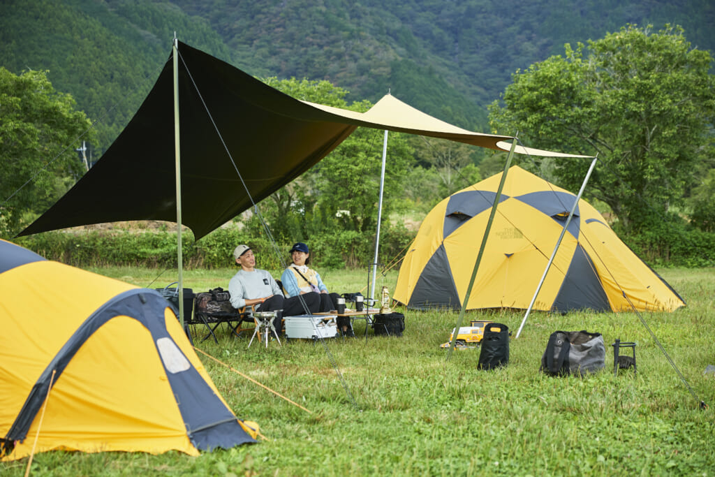 ザ・ノース・フェイスのサミットシリーズが好きだという2人は、サイトのカラーリングもテントに合わせたチョイス。中心に設けたリビングも、黒をベースに無機質なステンレス素材のギアを多用。ポイントとしてウッドの素材が生えるレイアウトに。すべてを手の届く範囲に集約させ、お気に入りのテントが目立つような工夫も。キャンプ中に遊ぶため持参したラジコンももちろん黄色のボディで、好きなものに囲まれた空間が完成した。