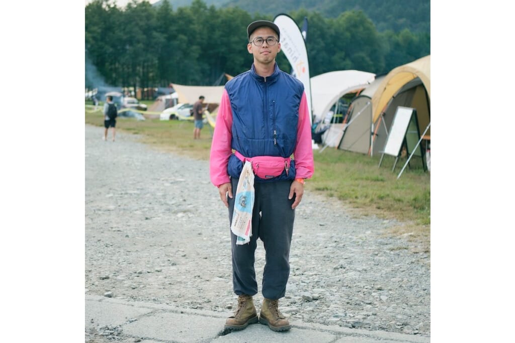トップスとウエストバッグは、 すべてパタゴニア。相性のいいピンクとネイビーの組み合わせが目を引き、手ぬぐいもアクセントに。17年愛用しているというダナーのブーツが引き締め役を担った。