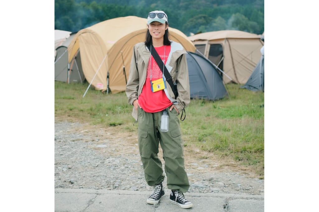 発色のいい赤の古着のTシャツをベースに、ベースボールキャップやカーゴパンツなどでアメカジスタイルを形成。 足元のオールスターは機能性よりも、味付け目的で、あえて新品をおろしたとのこと。