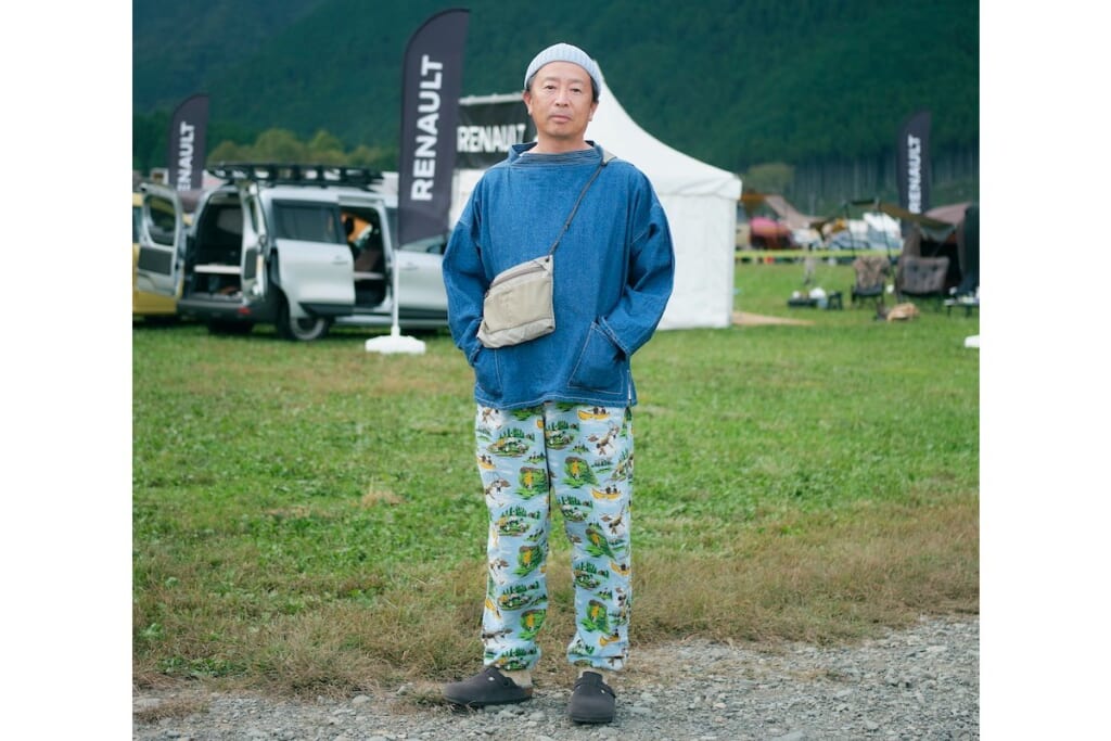 カヤックで釣りとキャンプを楽しむ姿をプリントしたパンツが着こなしの主役。その色味に合わせるようにデニムのプルオーバーシャツや水色のニットキャップなどを選び、コーデの統一感を出した。