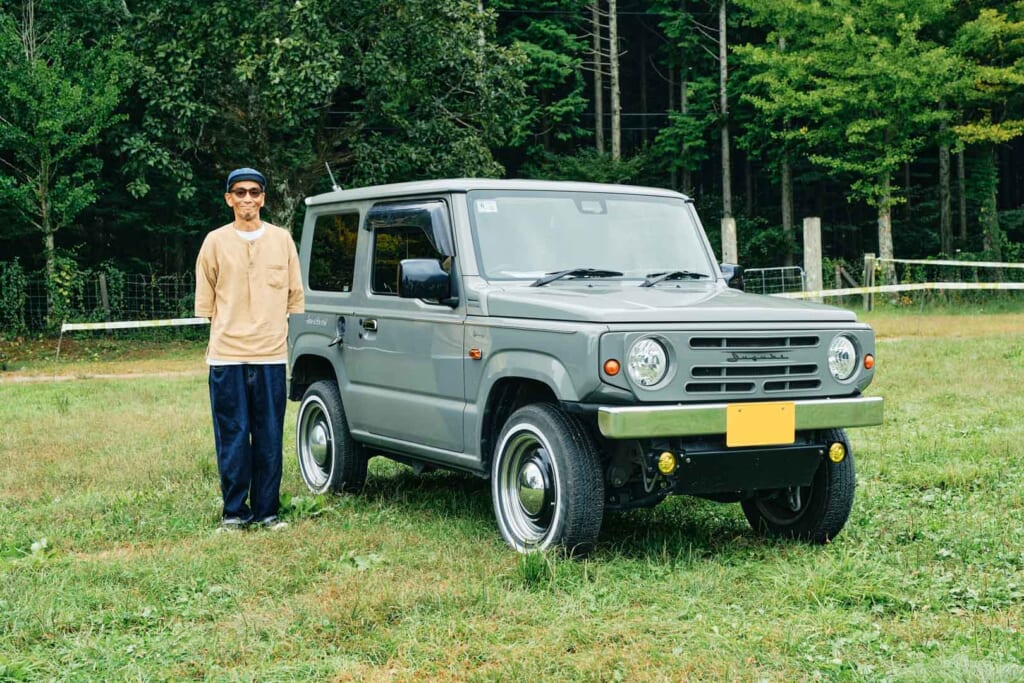 ソロキャンプをとことん満喫するため、エブリイワゴンから乗り換えたという1台。純正カラーのミディアムグレーの雰囲気に、エムブロの鉄チンホイールとホワイトリボンのタイヤがマッチ。フロントグリルはダムドのザ・ルーツ。