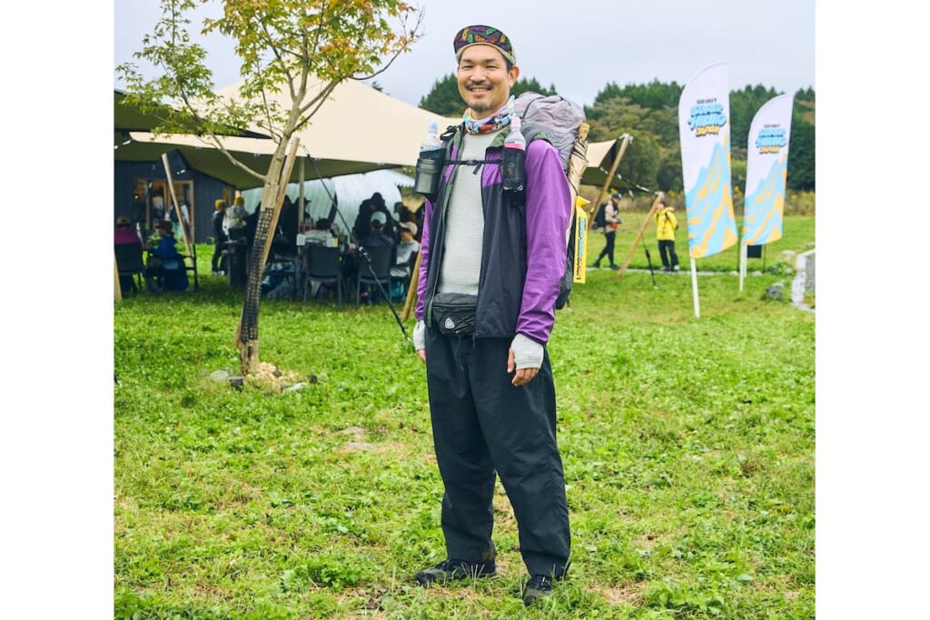 モノトーンをベースとした着こなしに風合いのあるパープルのジャケットをプラス。そこに柄物のキャップやネックゲーターを合わせることで顔まわりが明るくなり、彼ならではのオリジナリティを表現。