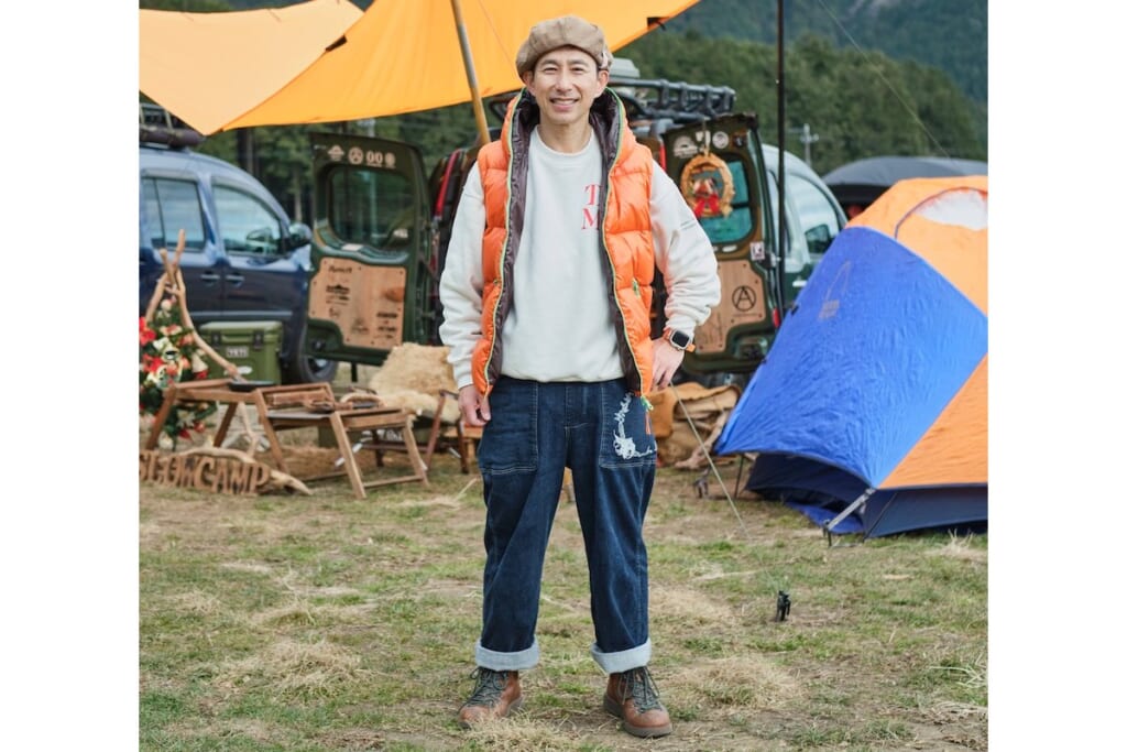 履き込んでいい風合いとなったブーツをベースに、スウェットとデニムパンツを合わせた直球アメカジスタイル。そこにダウンベスト、時計のベルト、ソックスなどで発色のいいオレンジを差し込み、個性を演出。