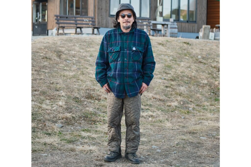 ややオーバーサイズのウールシャツはニュージーランド製で、柄と素材感が相まって、 冬らしさを演出。それと対比 するように、足元はキルティングのミリタリーパンツに無骨なワークブーツをチョイス。