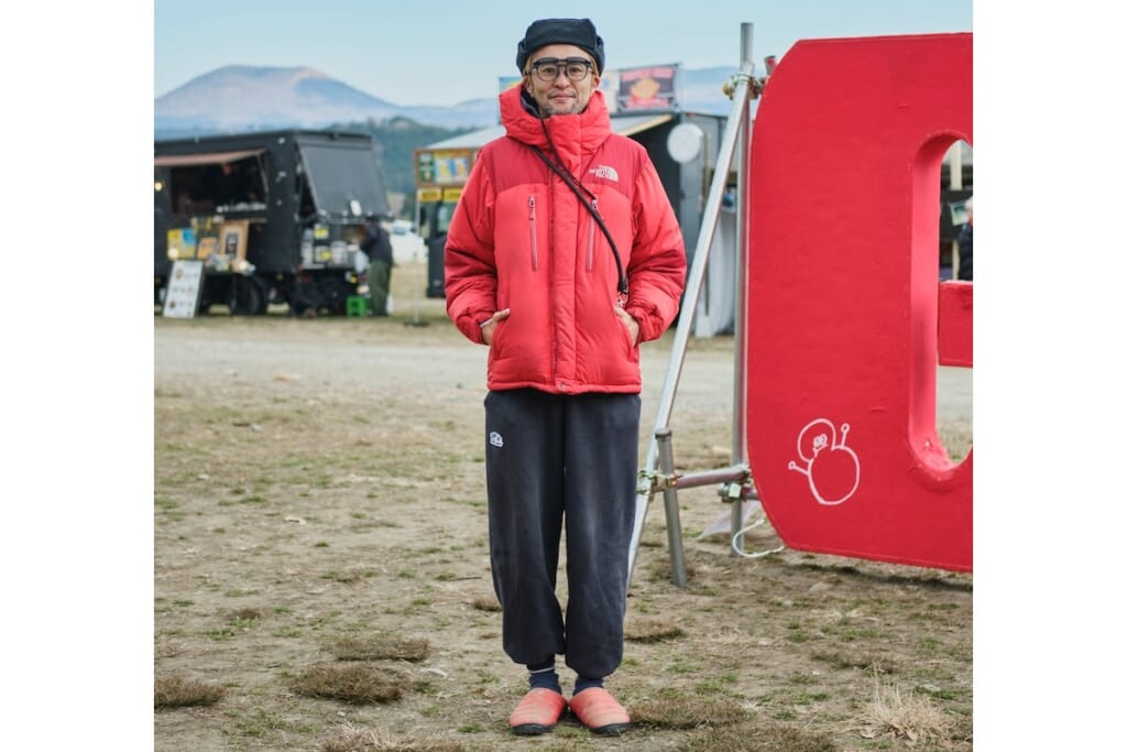 会場でも目を引いたのが、発色のいい赤のダウンジャケッ ト。その存在感を際立てるようにほかのウエアは黒で統一。 リブタイプのパンツにスブのサンダルを合わせることでリラックス感もアピールした。