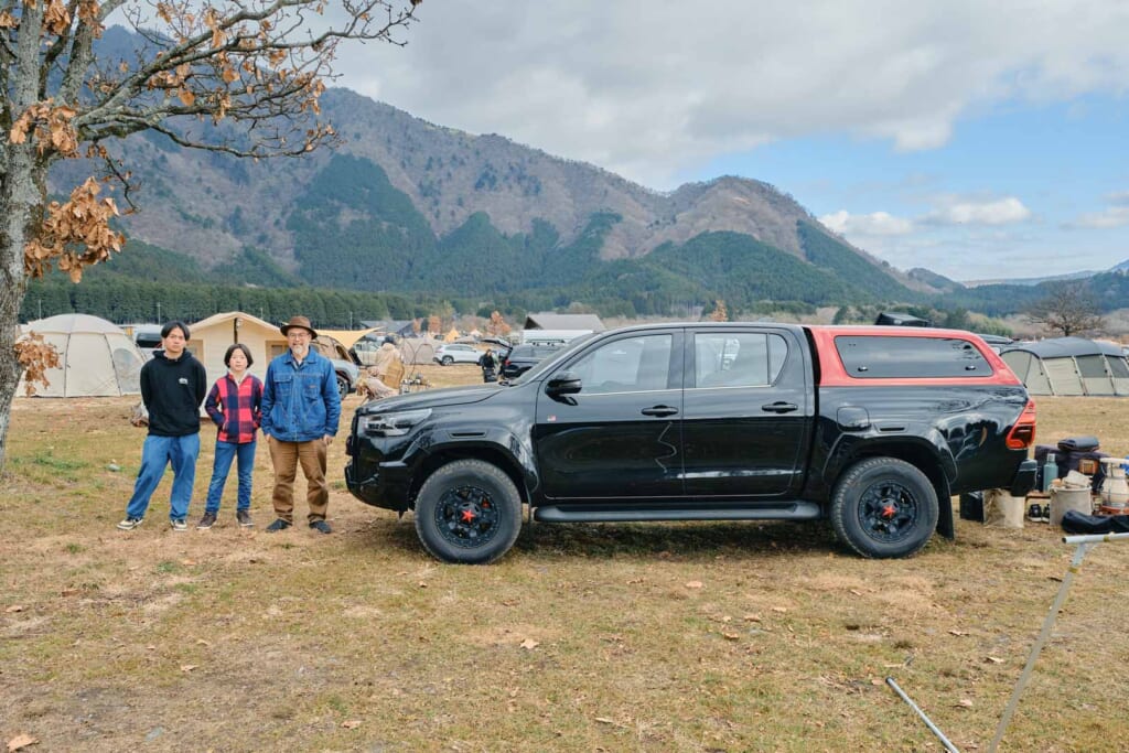 広いベッドスペースにキャンプ道具が満載のハイラックス。ホイールキャップの赤い星が足元を引き締める。「ブラックボディに映える赤いキャノピーは、富山のカー用品店で見つけました。運転席が少し持ち上がるので、後部座席のスペースが意外と広く使えます」。