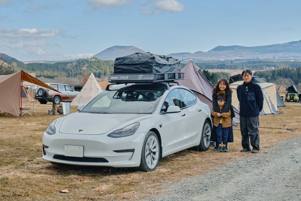 「試乗した時の発進時の加速が強烈で、EVの未来感を感じて購入。フロントに荷物が積めるのですが、気がついたらカーゴラックが一番大きなサイズになりました」。アウトドアで使える防水マットなどアフターパーツのラインナップが豊富なことも魅力だそう。