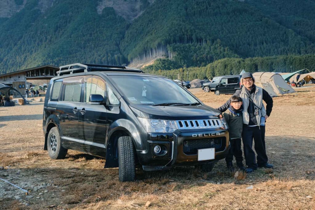 オールテレンやルーフラックなど、外遊び要素をプラスしたデリカ。「昔から冬のキャンプも楽しんでいるので、車内はいつもギアが満載です。今回は初めて冬の車中泊に挑戦するので、後部座席をフルフラットにして、マットと電気毛布で夜を乗り切るつもり」。
