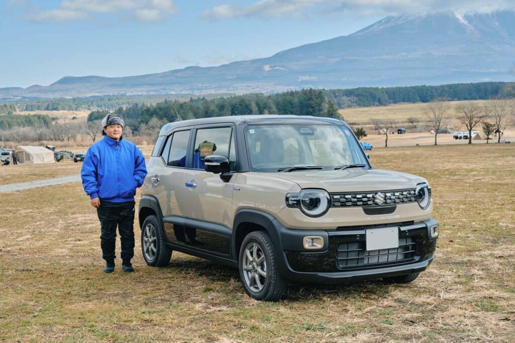 ジムニー納車待ちの間に選んだという愛車は発売されたばかりのクロスビー。「可愛い見た目で、低燃費なので運転するのが楽しいクルマですね。新型になってルックスが精悍になったのも購入の決め手。撥水シート、防汚ラゲッジフロアなどもアウトドア向き」。