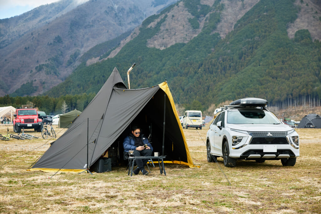 Shoさんのサイトは、「配色が気に入った」と話す黄色のラインが目を引くワンポールテントが目印。今回はソロ参加のため室内ですべてを完結させていたが、コンパクトなレイアウトの居住空間は、ハードケースを使った自作のキッチン台が一番のポイントに。こちらはデックスボックスというアイテムをオマージュし、入手可能なパーツを探して組み立てたそうで、すぐ真似したくなるアイデアに脱帽だ。