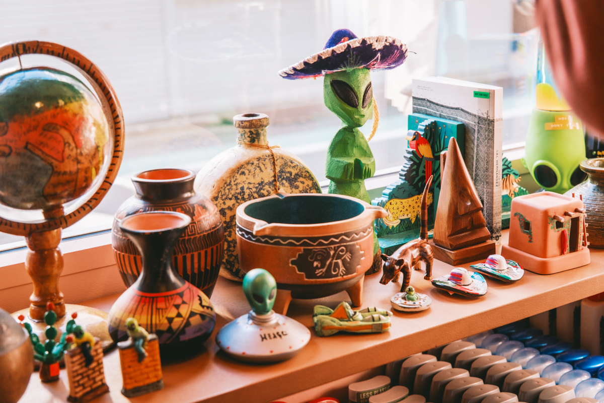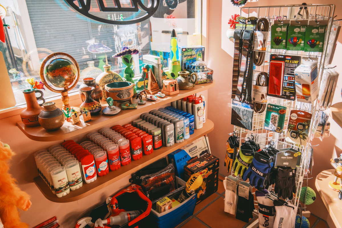 雑貨エリアでは、エイリアンや恐竜モチーフのアイテム、映画で登場したミニチュアなどのグッズも存在感がある。とくにエイリアンの存在感は抜群。ニューメキシコ州ロズウェルは、町おこしでエイリアンを前面に出している街として知られ、そこで見つけた木彫りのエイリアンは、横瀬さんがつい多めに買い付けてしまうお気に入りのひとつ。