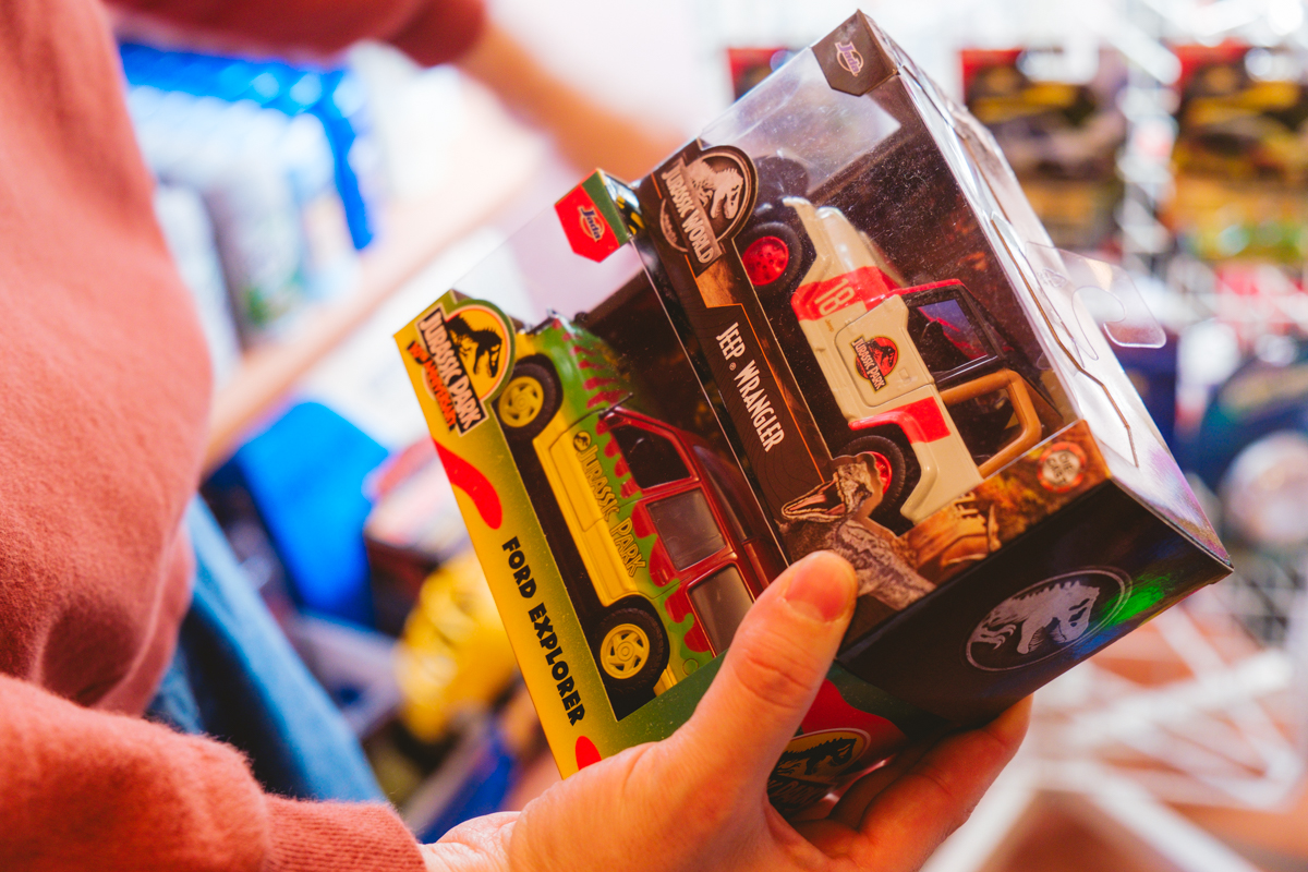 ジュラシックパークシリーズのミニカーなど、思わず手に取ってしまうグッズも。