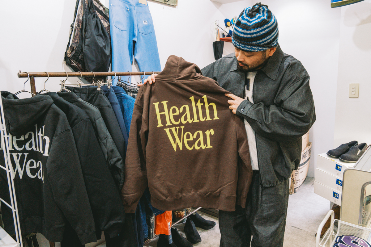 Apple社のロゴスウェットの文字組みやバランスを踏まえつつ、「HEALTH WEAR」のロゴをのせた一枚は、シンプルながらグッと来る存在感で、「ヘルスライダーストアって勝手に呼んでるんです」と宮川さん。