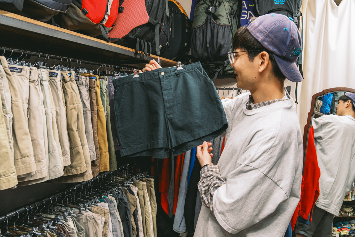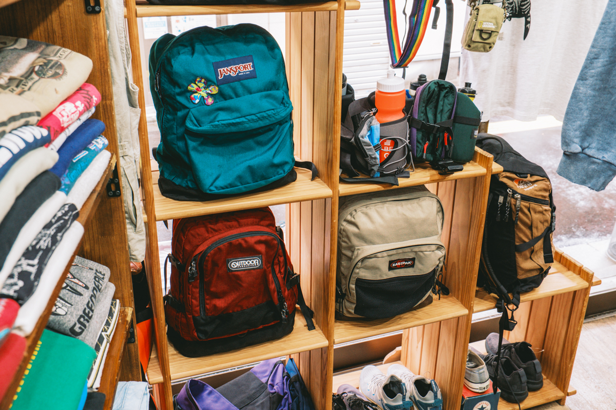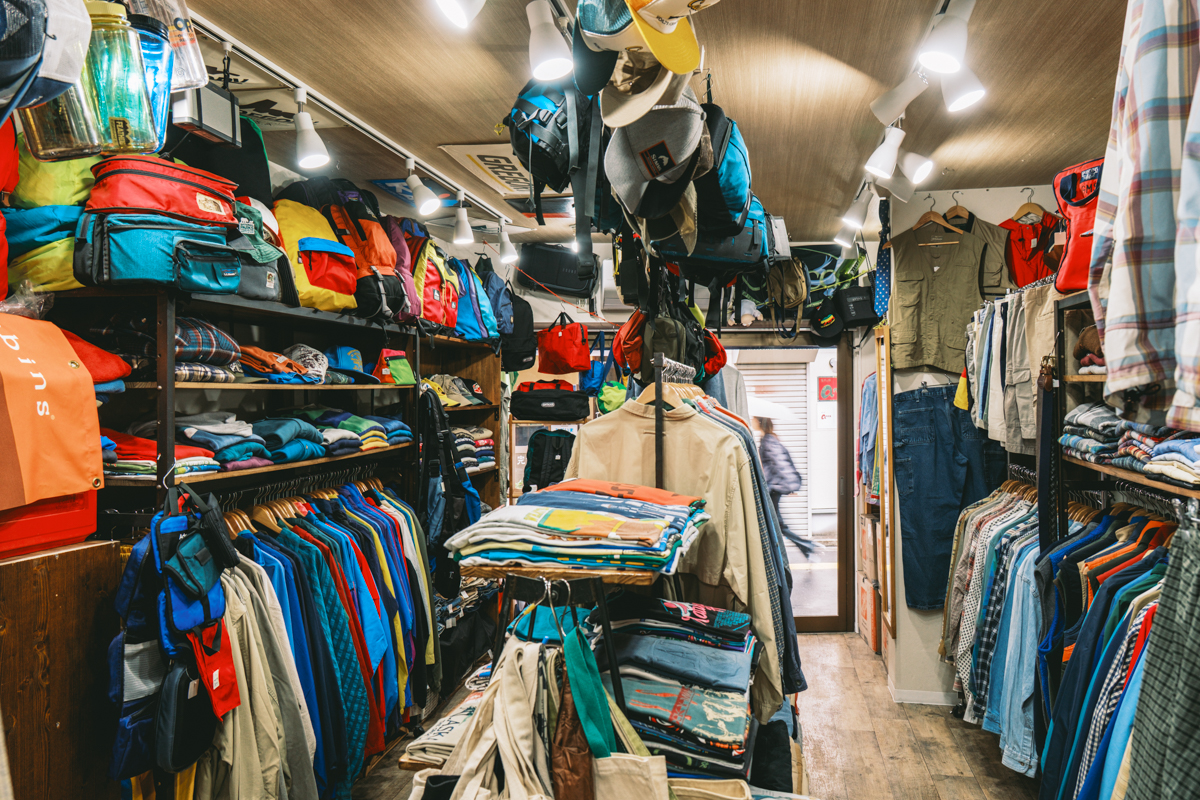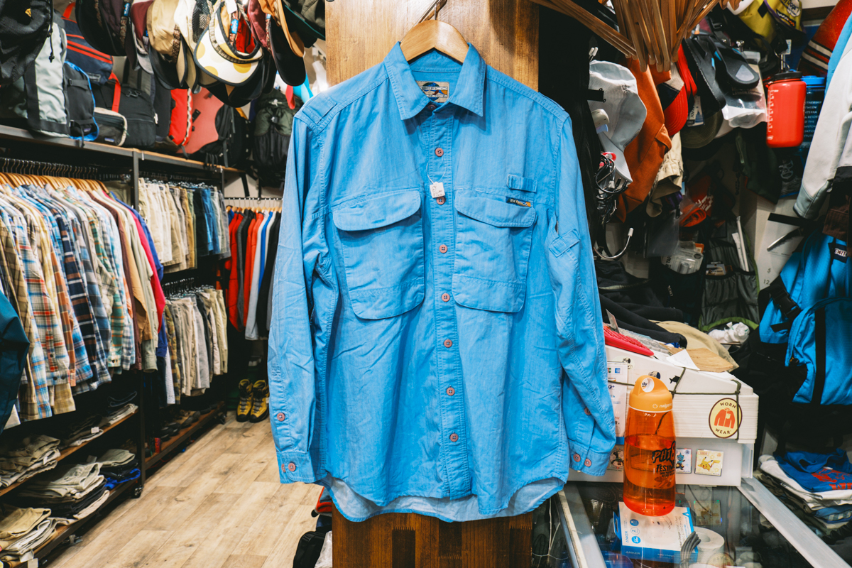 この店のおもしろさは、アウトドア古着をひとつのジャンルとしてきちんと深掘りして見せているところだ。シャツ、ショーツ、バッグとカテゴリをまたぎながら、年代やサイズ、色の違いまで含めて並んでいるから、最初から狙っていたものだけでなく、「これもアリかも」と思える一着に出会える。